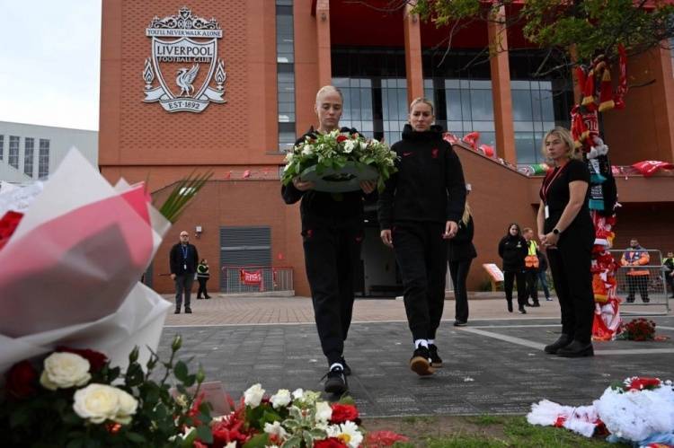 她们还代表球队献上了一个花圈,加入到过去几天里放置在安菲尔德球场外的大量悼念物品之中。